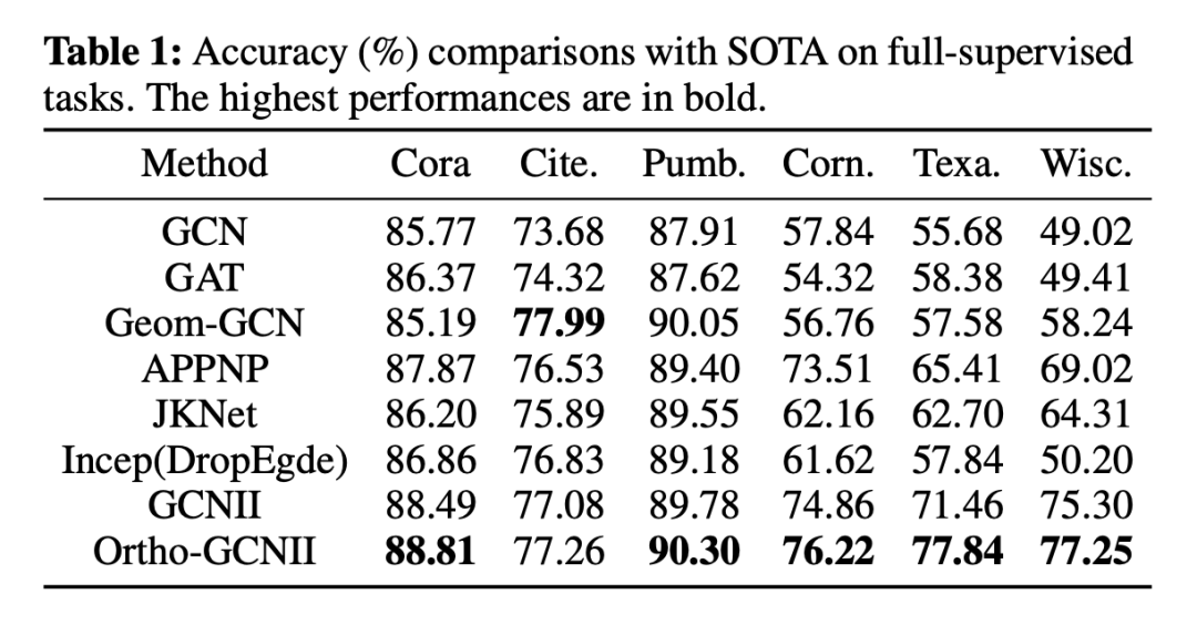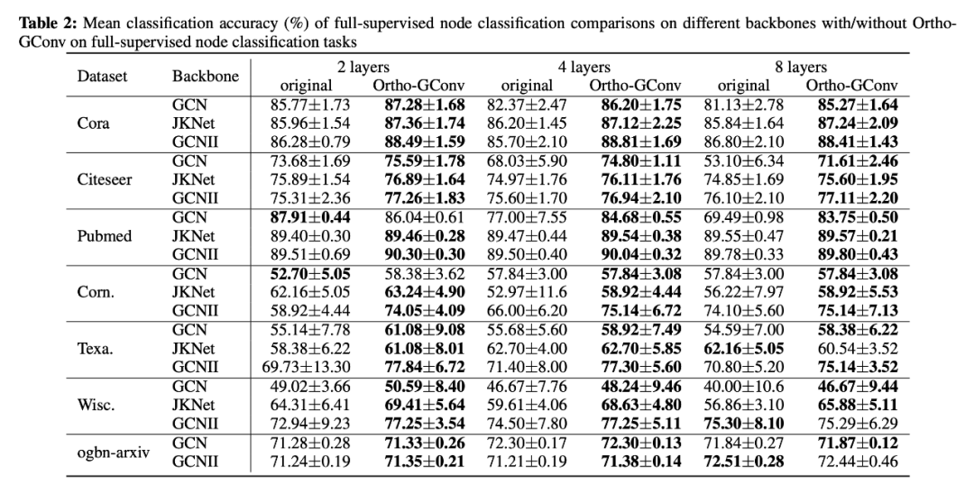 测试了在六个上的分类精确度,并进行了比较,Ortho-GCNII 的平均提升为 2.2%。