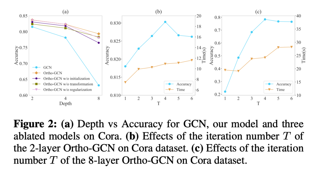在不同的层数下,Ortho-GConv 在性能上都有一定的提升。在 Cora 和 Citeseer 上,Ortho-GConv 在 2 层基础上分别实现了 1.9% 和 2.1% 的提升;而在 8 层的情况下,获得了 2.8% 和 12.4% 的提升。