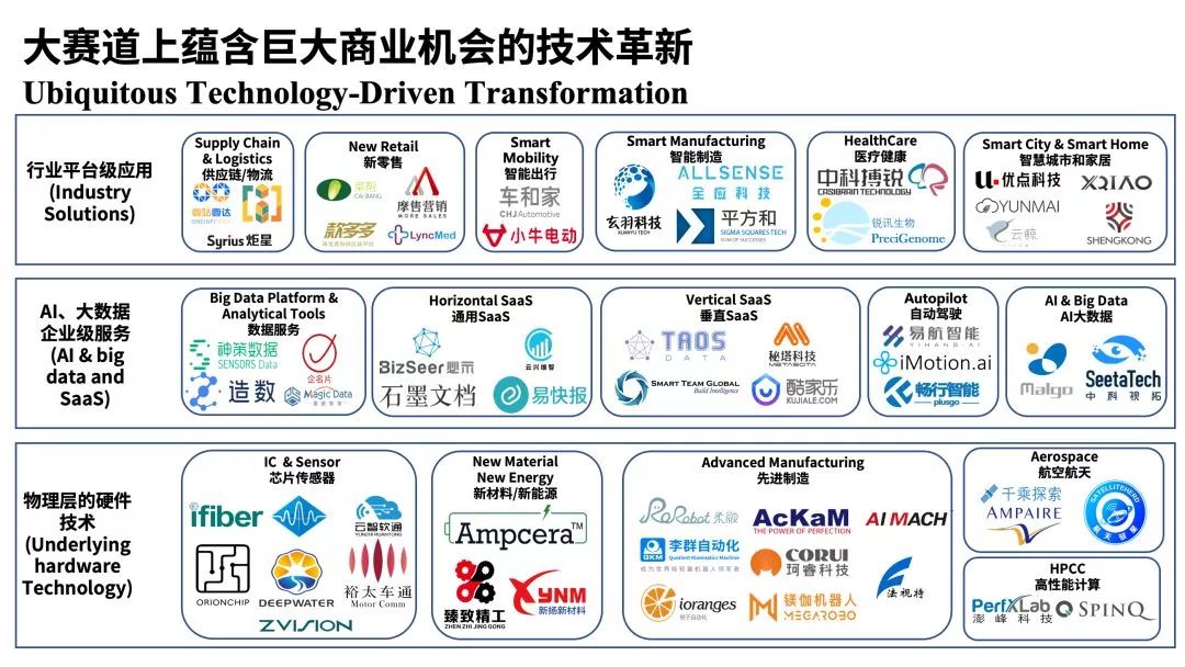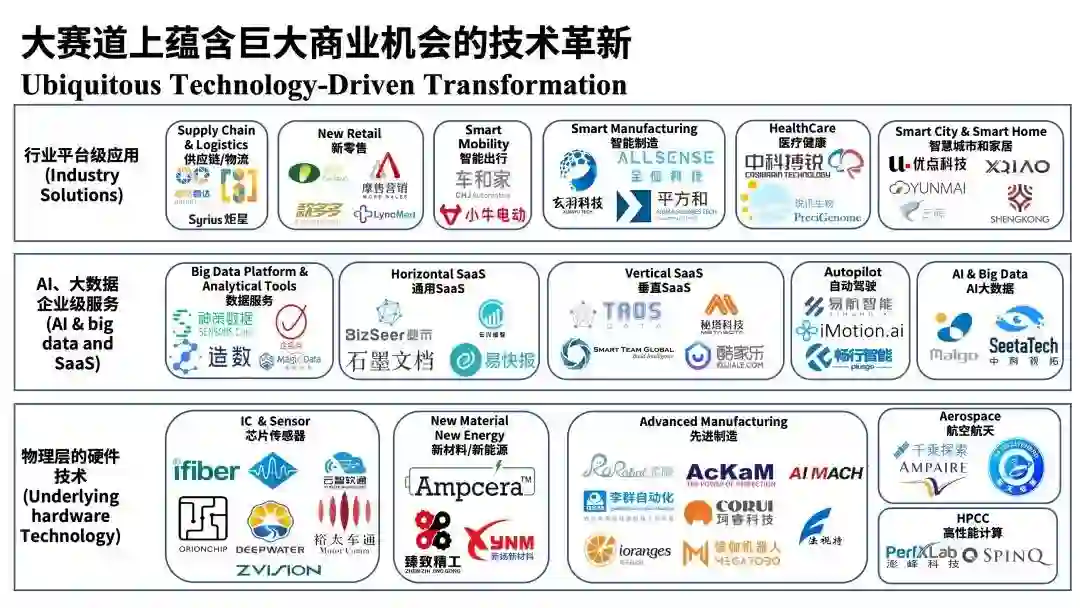 我们今年升级的打法是什么呢?不仅希望找到在单点技术上有突破、有价值的公司,这还不够。我们希望能够站在产业的视角,去深度挖掘和梳理技术创新带来的平台级的行业应用公司。首先我们列出了万亿甚至是10万亿人民币产值以上的六大行业。行业要足够大,同时行业传统的产能越是落后,科技创新带来的价值就越大。我们希望在这些行业里面找到平台级的科技公司,能够利用软硬件结合的方案整合产业链上下游的成千上万的players,帮助他们完成在线数字化和云端协同化,从而给整个行业带来效率的巨大提升。这些头部的平台级公司在未来的天花板很高。我们讲的是在万亿的大赛道里寻找百亿美金甚至千亿美金的机会。
