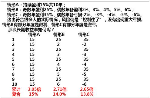 情形A还是一个15%的收益率,这是一个我们比较的标准,一共十年大约你赚了三倍左右。这个情形B和情形C是什么情况呢?就算你的收益率比较高,比如说达到25%、35%,但是如果中间参插些微亏微赚的平淡年份,如果这些平淡年度太多也是非常影响长期收益率的,这主要体现料时间成本的问题上。我们在做投资的时候,如果你总是平平淡淡或者你平淡的年数太多,对于你积累财富也是非常不利的,所以说财富如果只是单纯的守你是守不住的。如果你每年赢利就是两三个百分点,那你首先面对一个通货膨胀的风险,对你长期的财富增长也是非常不利的,所以我觉得负复利三个因素:第一个较大的亏损,第二个亏损的次数和幅度,第三个平平淡淡的年份太多,这些对我们的长期复利具有较大的影响。很多人某一年赚了十倍,但是可能十年都赚不到十倍,为什么?因为他第一年赚了十倍,后面的九年都守不住第一年他赚到的钱,真是这样的:周期一旦拉长很多真相自然会浮出水面,所以我们做投资一定要有一个比较长期的观点,在这个长期的投资过程中一些核心的要素要有一定的认识。