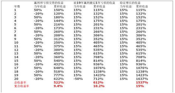 这个复利表,当我在十多年前年轻时做投资的时候,也是支撑我做投资的一个基础,因为虽然这个收益率不是很高,但我们只要坚持下去,这个财富的积累程度是非常可怕的。但是对这个复利的认识,如果仅仅是停留在一个稳定增长、每年增长多少,然后十年二十年增长多少,如果仅仅是停留在这个程度,那么对复利的认识是不完整的。这里我特别要强调对我们复利增长的一些有负面因素:可以看到在这张表格的中间这一栏,每年都是15%的增长,到第二十年的时候,如果这个增长突然中断,假设这个年度的收益率回撤50%,在投资这二十年的过程当中,你如果有一年表现比较差,那么这二十年积累的总体收益相差是非常大的。你只要犯一次严重的错误,那么二十年下来你的财富可能会缩水三分之二左右。也就是说在我们投资的一个历史当中,一次较大的亏损对我们财富积累的影响是非常大的。