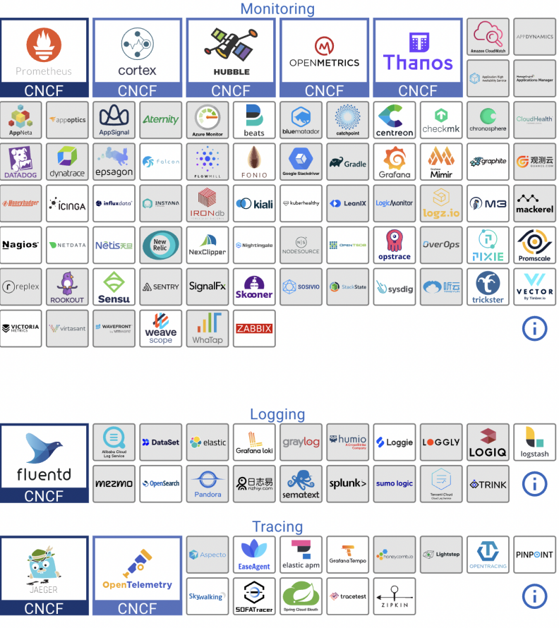 云原生基金会的项目全景图(CNCF Landscape)根据项目特点与价值,将提供可观测性能力的项目分为了监控(Monitoring)、追踪(Tracing)、日志(Logging)三类(如图 2 所示)。