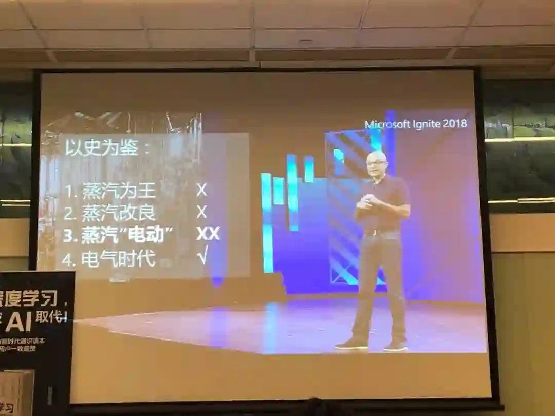 去年10月份微软公司CEO萨提亚的一场非常有名的演讲上说,未来没有人引导我们,那么我们可以以史为鉴,看看历史上发生过什么。最有代表性的就是第一次工业革命到第二次工业革命之间,由蒸汽时代进入电气化时代。我把这个阶段总结为四种态度和四种结局。当时有很多有影响力的全球性的公司,他们用蒸汽力量代替人的四肢。但当电气出现的时候,绝大多数公司态度是看不起电,因为开始的阶段电的效率并不够高。第一类公司的想法是电力不行,效率低,没有未来,蒸汽力量足够了,一百年之后他们被淘汰了。