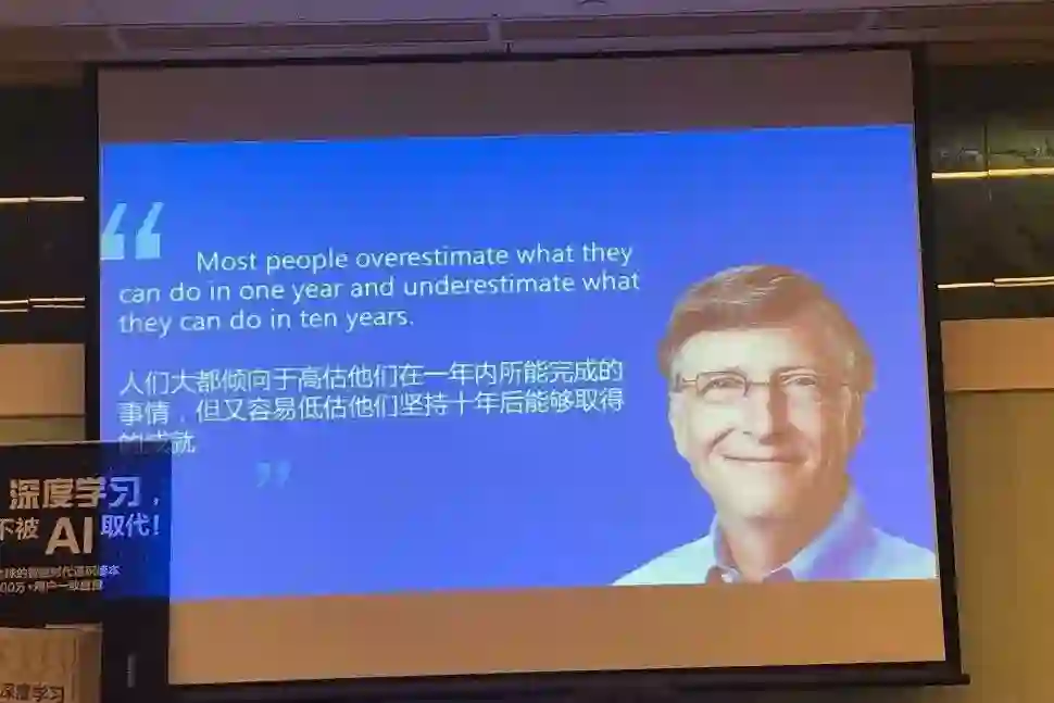 最后以比尔·盖茨先生的这段话作为结尾:“人们大都倾向于高估他在一年内所能完成的事情,但又容易低估他们坚持十年后能够取得的成就。”大家一定要明白,第一没有专家,第二没有起跑线,第三每天都在重新更新有新知识新理念出现,先不要放弃自己,同时把握最基本的对自己的自信和信念,认真学习。