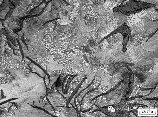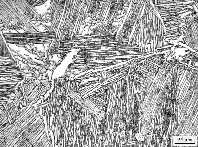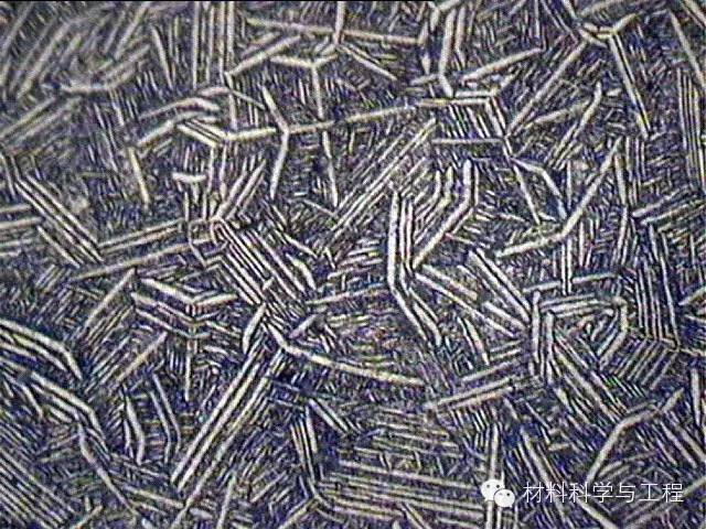 【71李金梅】低合金钢经4%硝酸酒精溶液侵蚀后,针状先共析铁素体沿原奥氏体晶界析出,向内部生长,平行排列。就像大海平面风浪乍起时景象。