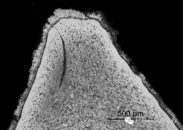 【67刘兴智】仪器:徕卡leica DMILM倒置金相显微镜。作品名称:表面防护后的折叠腐蚀。作品介绍:锌镍渗层表面防护的螺栓(材料Q235)中性盐雾试验时齿顶红锈。在红锈处解剖,螺栓在制作时有折叠,因毛细作用吸入盐水,基体中的折叠因腐蚀出现宽化,而与渗层相邻的折叠未受腐蚀,沿齿边缘分布的白色区域是制备渗层时的扩散层。