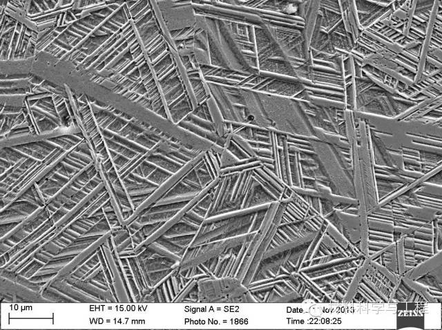 【74张宝燕】材料介绍:Fe-Mn合金。仪器:Zeiss Suppra55型场发射扫描电子显微镜。作品描述:Fe-Mn阻尼合金在一定的诱发变形下形成的马氏体。
