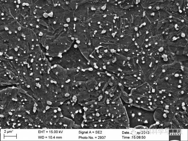 【72张宝燕】材料介绍:H13(4Cr5MoSiV1)模具钢。仪器:Zeiss Suppra55型场发射扫描电子显微镜。作品描述:H13钢球化退火保温一段时间直接淬火得到基体马氏体+球状碳化物。
