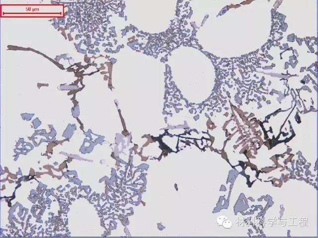 【62王元瑞】材料:ZL111 铝锭。拍摄仪器:Leica DM5000 光学显微镜(明场)。侵蚀方法:0.5%HF,混合酸,20%硫酸等试剂。组织说明:α(Al)+共晶Si+海蓝色Mg2Si 相+亮色Al2Cu 相+棕红色W(AlxCu4Mg4Si4)相+浅灰色Al8FeMg3Si6 相+咖啡色AlFeMnSi 相;选取不同的试剂来显示各个相的形貌。