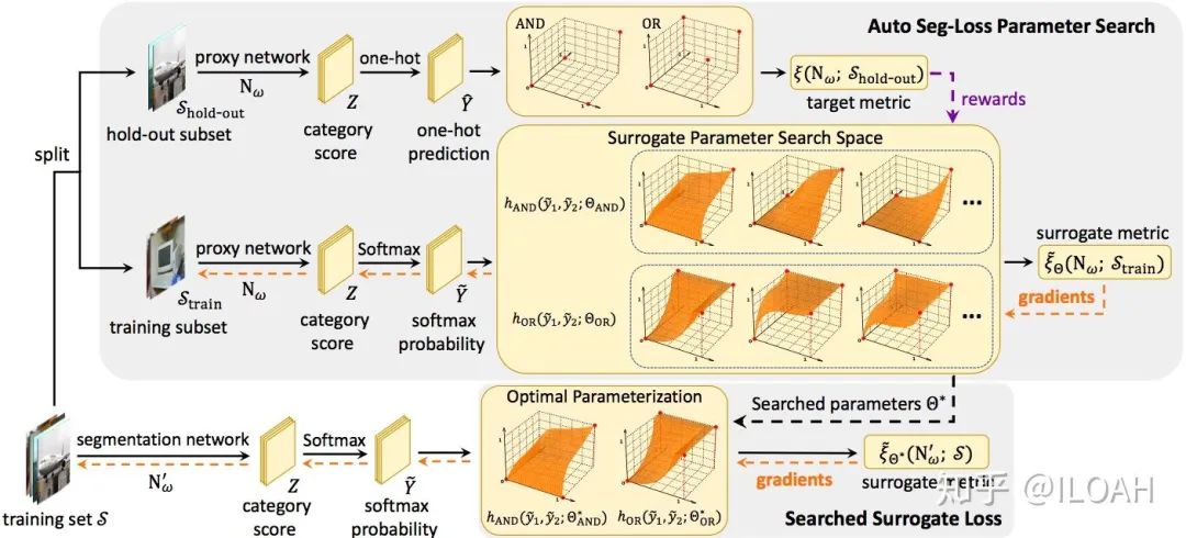 Auto Seg-Loss 希望(在语义分割任务上)将这个流程自动化。简单来说,我们发现主流的语义分割指标(基本由TP/TN/FP/FN组成)都能写成可微运算(比如加、乘)、量化(one-hot)和logical运算(与AND、或OR)的形式。由于logical运算实际上只定义在 上,我们使用一个参数化的曲面对logical运算进行插值,使得其在