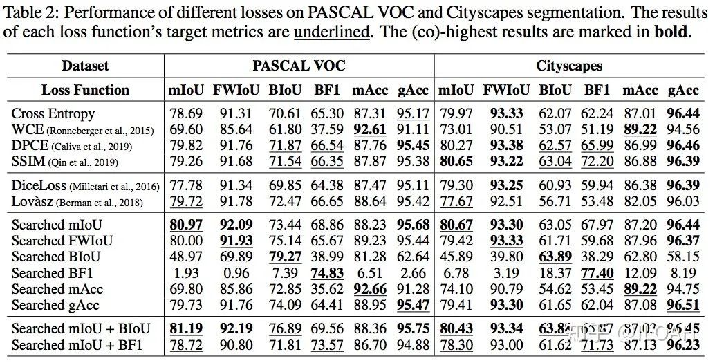 我们在PASCAL VOC和Cityscapes上进行了实验。相对于手动设计的代理损失函数或Cross Entropy的改进,搜索出来的代理损失函数在主流的语义分割指标上都能达到on par或更高的水平,尤其对边缘相关指标的提升比较大。值得一提的有两点:
