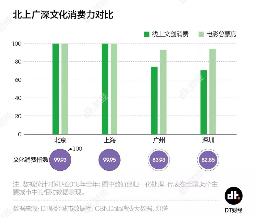 以城市居民购买线上文创产品和为电影贡献票房作为文化消费代表指标,DT君还评估对比了几个城市的文化消费力。