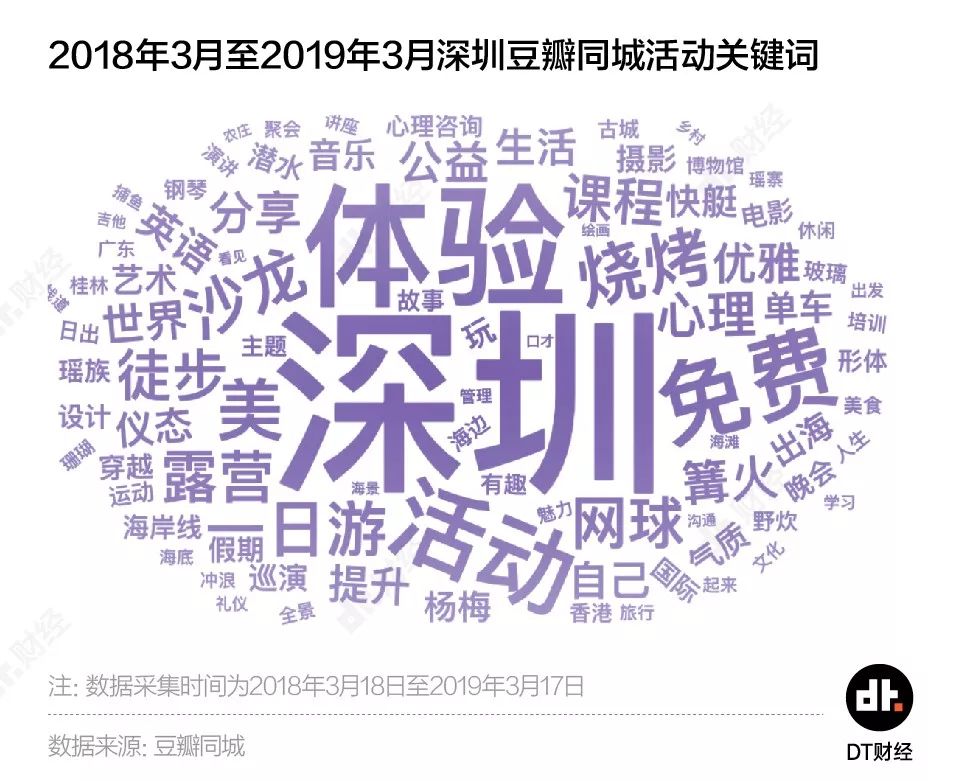 提取深圳过去一年的1万场活动名进行分析,“体验”、“烧烤”、“公益”、“课程”等都是出现频率较高的词。另外,与大海有关的词被反复提起,比如“出海”、“潜水”、“海岸线”、“快艇”等,海滨城市的特色彰显无疑。而“提升”、“课程”、“沙龙”、“英语”等词的存在感也挺高,体现出了深圳文化的奋斗基因。