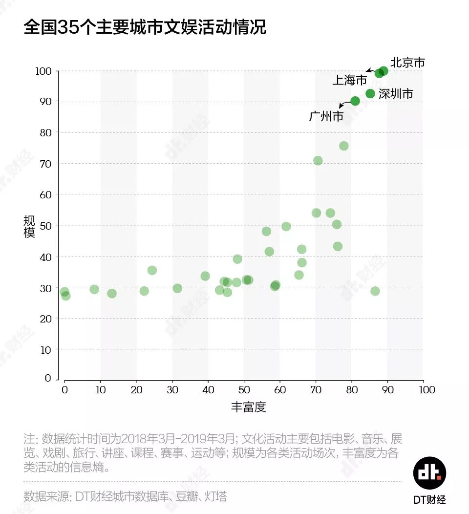 综合电影放映场次和“豆瓣同城”上的活动信息,DT君从规模和丰富度两个层面对主要城市的文娱活动进行了评价比较。