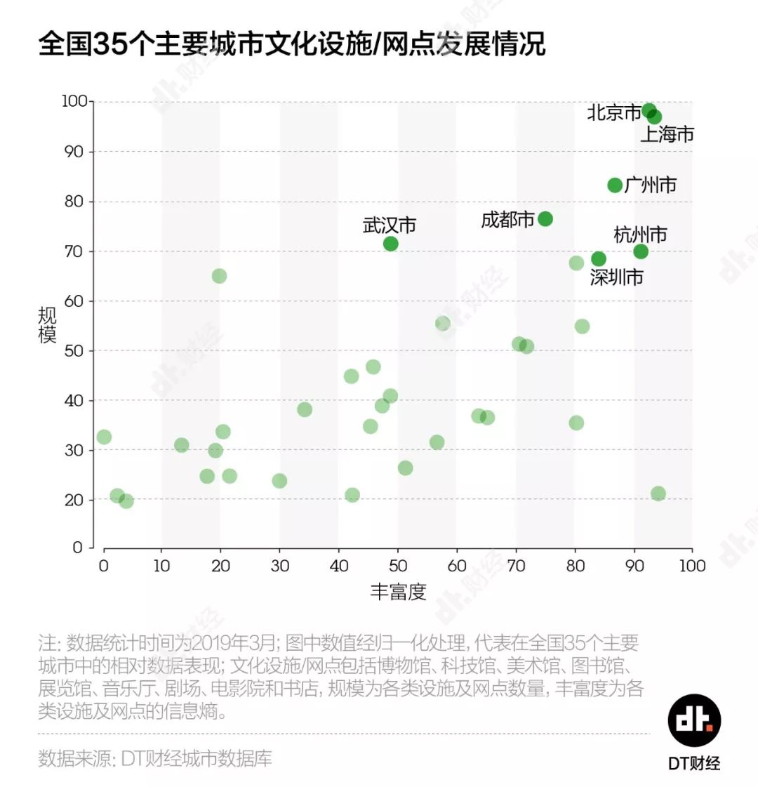 我们采集了主要城市博物馆、科技馆、美术馆、图书馆、展览馆、音乐厅、剧场、电影院和书店等文化场所的信息,从规模和丰富度两个维度对全国35个主要城市进行了评价——文化场所的数量足够多、类别足够丰富,也就意味着一个城市有条件提供更多元与充沛的文化生活。