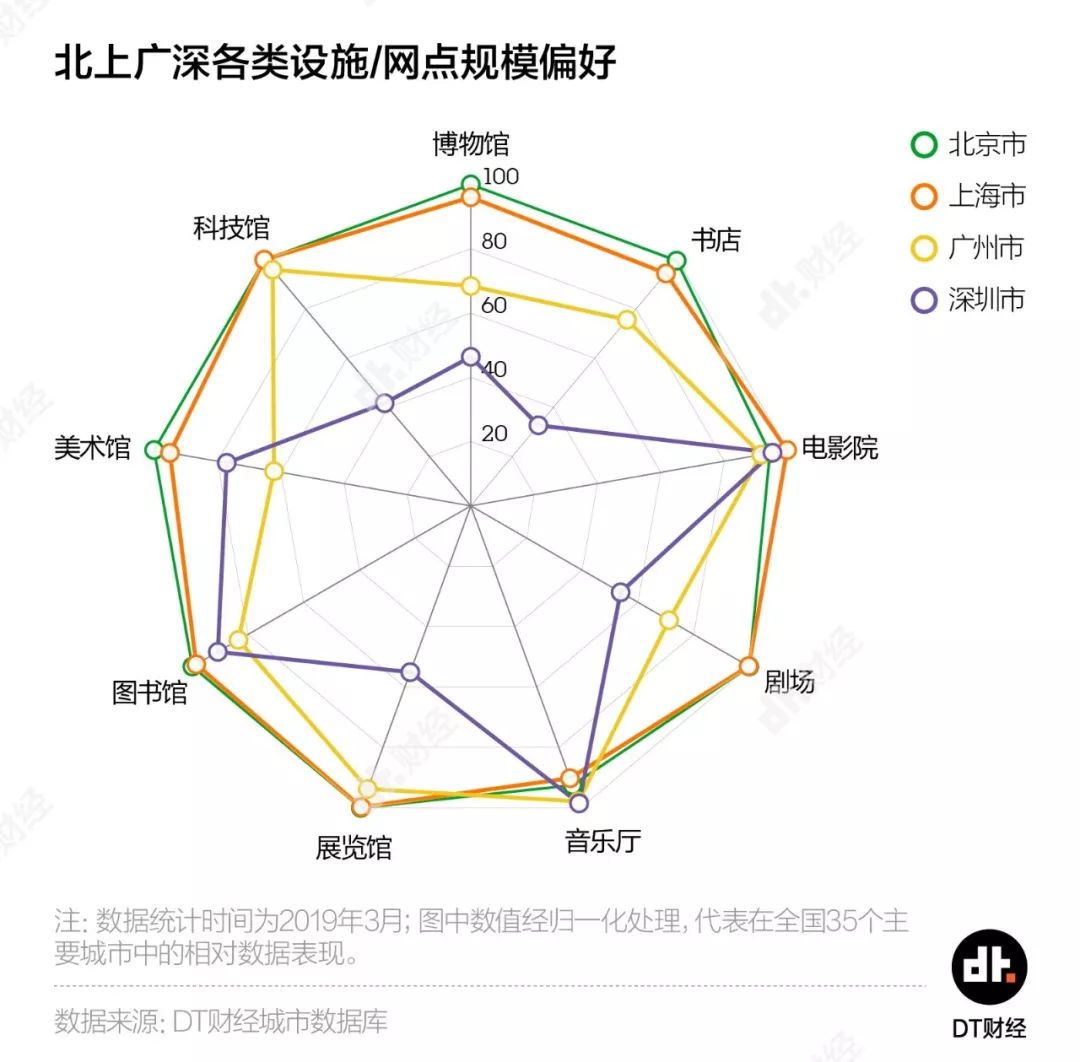 更具体来看,深圳在音乐厅、图书馆和电影院这几项上其实表现并不弱,差距主要是被书店、剧场、博物馆、展览馆和科技馆拉开。