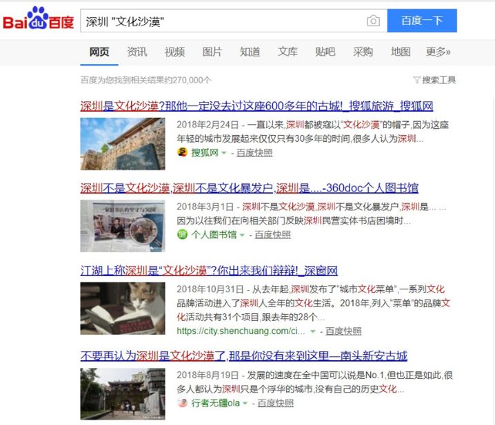 (图为以“文化沙漠”、“深圳”为关键词搜索的百度页面截图。来源:百度搜索。)