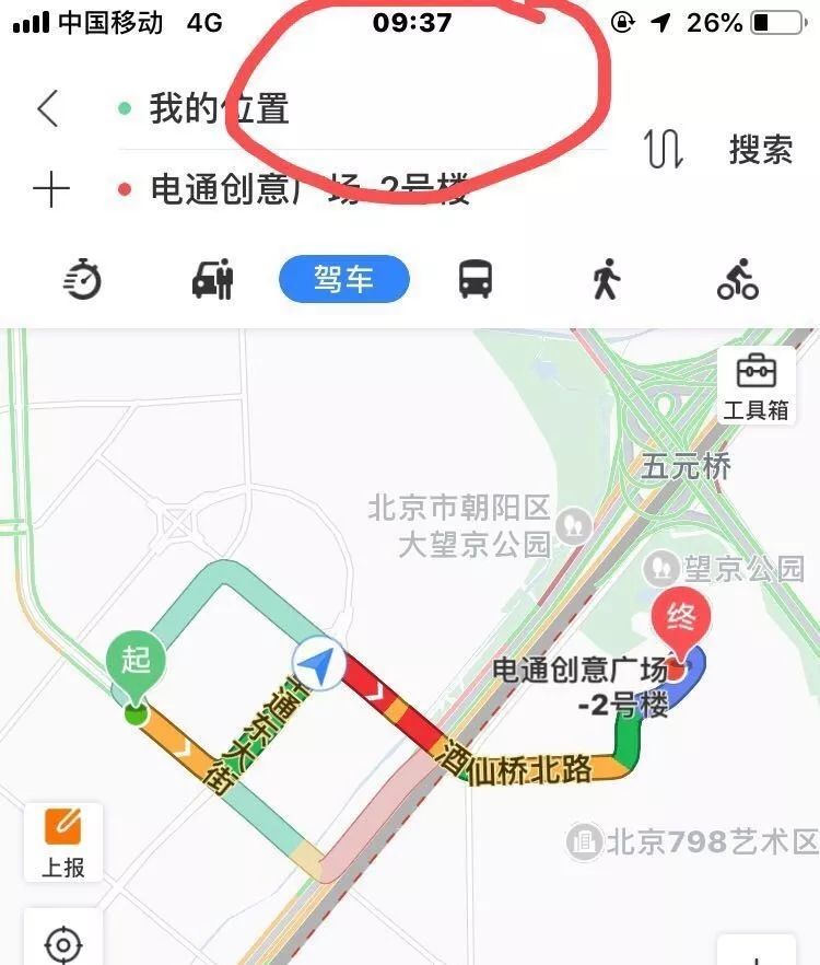 早上9:37(此时已算是弱高峰了哦),老创乘车到达望京阜通东大街与望京街交叉口,此时,距离通过大山子路口仅有777米的距离。