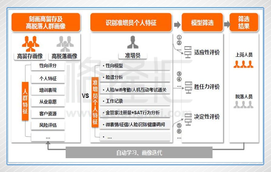 比如,运用大数据生成客户画像,实现差异化客户经营,精准投放产品。再比如将智能科技运用到寿险业务员的招募,可以做到精准和高效,提高留存率。在招募环节,对每个面试者的言行进行记录,得到一系列标签,存入面试者画像库;而在试用或入职后,对其销售行为模式进行记录分析,可以得到具有高销售业绩的从业员具有的特征,将高留存画像匹配到面试者画像库中,便可以得到潜在高留存者的面试表现特征。