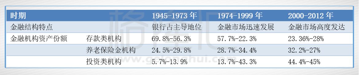 在评选四大条件中,宇宙行凭借中国绝对的头部资产就能拿到入场券了。但是,以美国的金融市场发展经验看,经过以银行业为主导地位阶段后,金融市场进入快速发展阶段,间接融资的银行等存款类机构的占比不断下降,而保险、证券等则是顺势崛起。资料来源:张立强,《转型时期我国金融结构研究》,2013-5