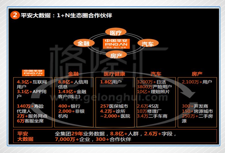 金融生态圈还有陆金所、一账通;医疗生态圈有平安好医生;汽车生态圈有汽车之家;房地产生态圈有平安好房。