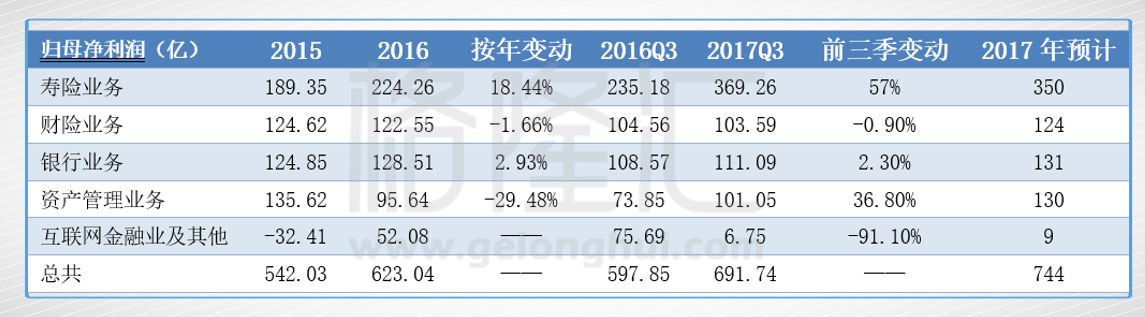 2017年Q3平安的归母净利润是663亿,其中超过一半是寿险净利润,从近两年的净利润结构看,寿险的净利润比重逐渐提升。由于2017年还未有年报,基于2016年年报和前三季度的数据,预计2017年平安的净利润在744亿左右。(注:互联网金融业波动比较大,主要是司2016年上半年有一笔普惠金融重组94.97亿元的交易)
