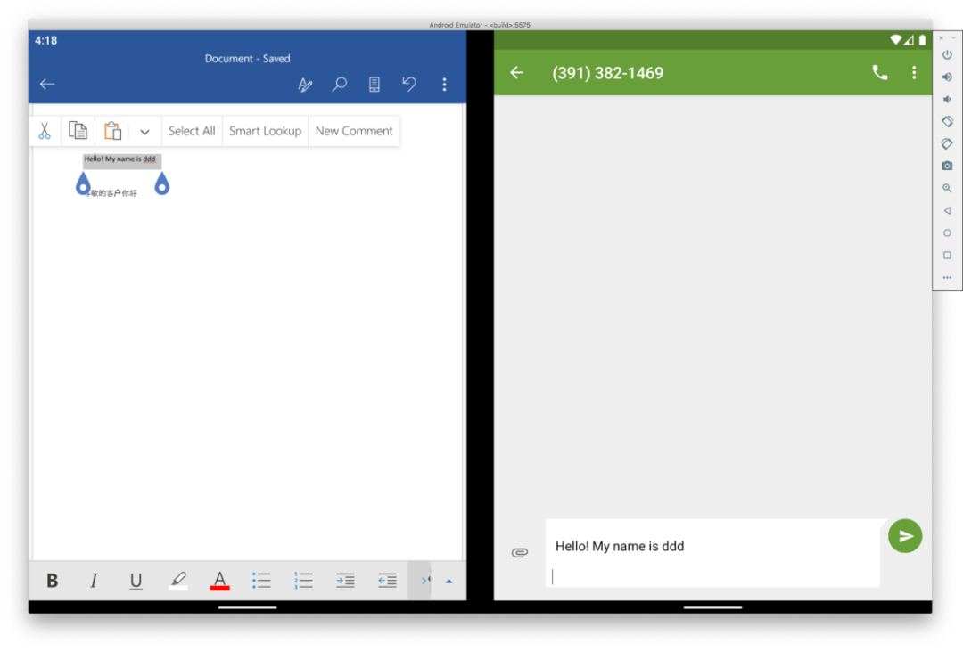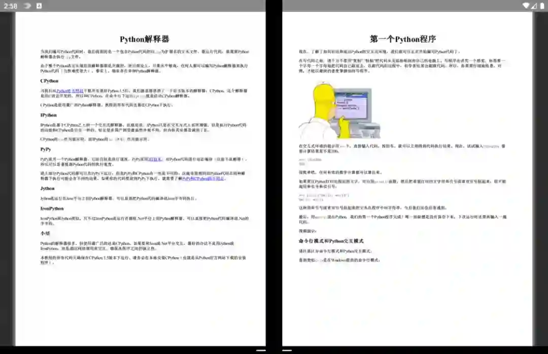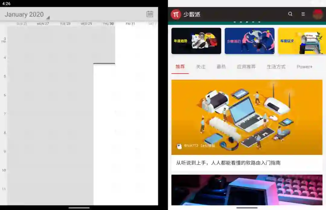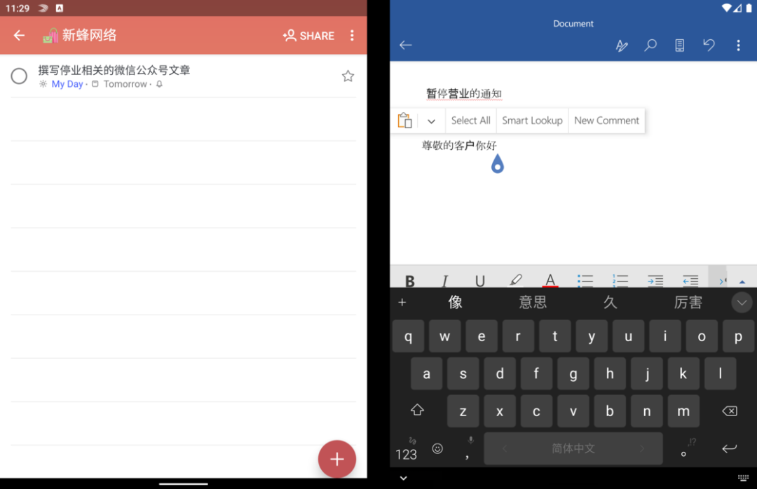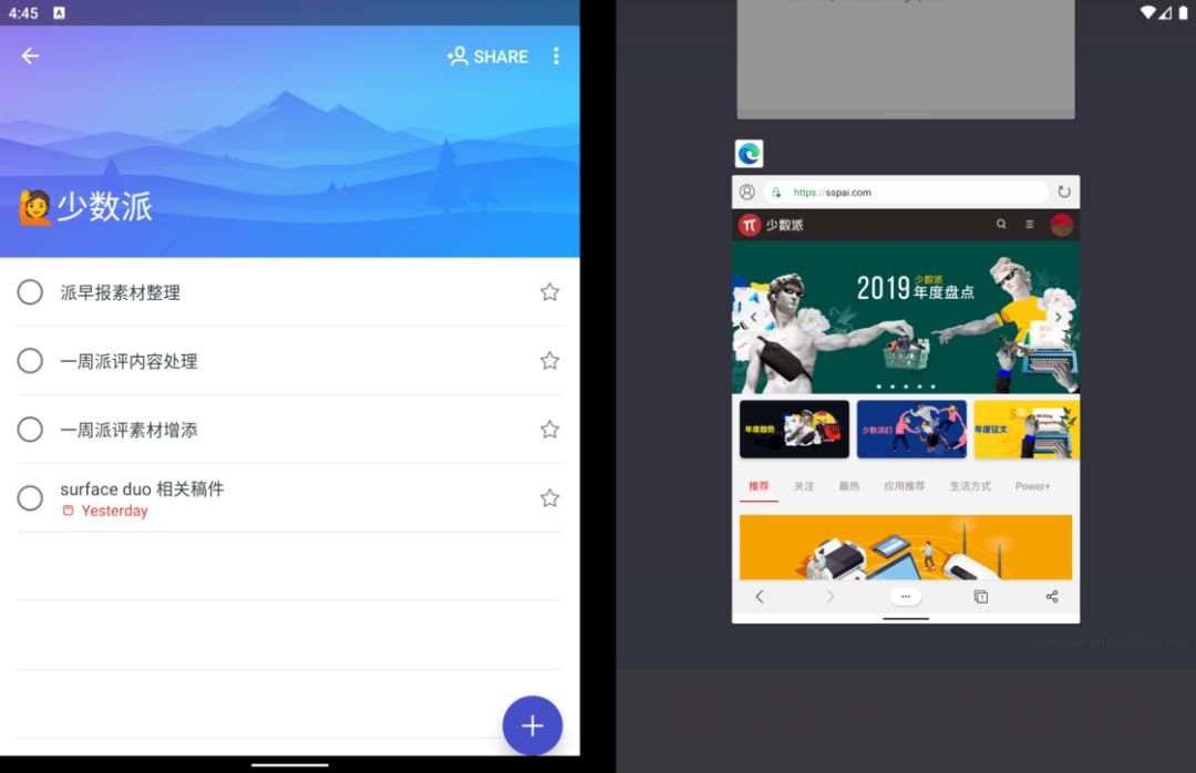 和我们在发布会上看到 Surface Duo 的各种形态类似,Surface 这种以「变形」为卖点的设备,双屏的变换当然不可能只有「开页式双屏」。要知道「开页式双屏」在一些需要大屏幕浏览的场景上显得极为突兀——毕竟物理铰链的存在会造成屏幕显示内容的割裂。因此 Surface Duo 模拟器系统也支持上下双屏,这种形态更接近我们通常看到的笔记本电脑或二合一设备,位于下方的屏幕既可以当作触摸键盘,也可以用来对上侧显示内容进行补充。上下双屏状态下编辑 Word 文档这样的双屏设计非常适合文本编辑或浏览网页,阅读时可以有效地使用单个屏幕的最大宽度,也不会造成横向的画面内容切割。上下屏浏览网页的效果就未来 Surface Duo 的使用场景而言,对开页双屏显示依然会是其最大的亮点,但这种体验还需要应用本身的适配和跟进作为支撑。以笔记类应用为例,我选择了自己最常使用的印象笔记,从下图中不难看出,即便适配了 Android 平板设备的显示布局,这些应用在 Surface Duo 模拟器上也难以有效利用左右双屏进行优化。当然除了同一个应用利用两侧屏幕的场景,Surface Duo 退一步来讲也可以做到类似「电子行事簿」那样的用法:借助微软的账号数据同步体系,我们可以将日历事项、微软待办、文档编辑这类工作有机分配到屏幕两侧。在这个过程中 Android 系统本身的特性能够结合设备形态发挥出很好的效果。左右两侧屏幕分列应用时,任意一侧都可以通过多任务界面在不同应用间快速切换,同时我们也可以像原生 Android 分屏应用时那样在不同窗口之间拖动来快速复制、粘贴文本内容。左侧待办事项,右侧切换应用拖动即可复制粘贴文本内容最后,对于开页式双屏,阅读电子书也是一个较为实际的使用场景之一。不过由于模拟器架构限制(只能安装 X86架构的 APK 安装包),我暂时无法安装包括 Kindle、微信读书在内的一大票阅读 App,不过基于手机上这两款 App 的表现,实现开页式效果并不复杂。微信阅读的网页版本倒是可以正常打开,但并不支持类似阅读纸质书那样的开页效果。至于 PDF,我尝试了一款名为 PockerBook 这样的一款电子书阅读应用,终于实现了类似开页式的翻书效果,无论是备注还是书签效果都非常不错。
