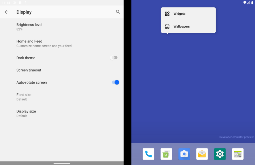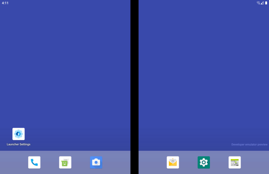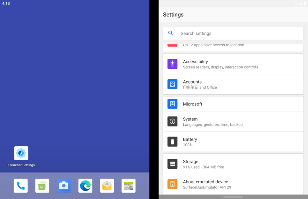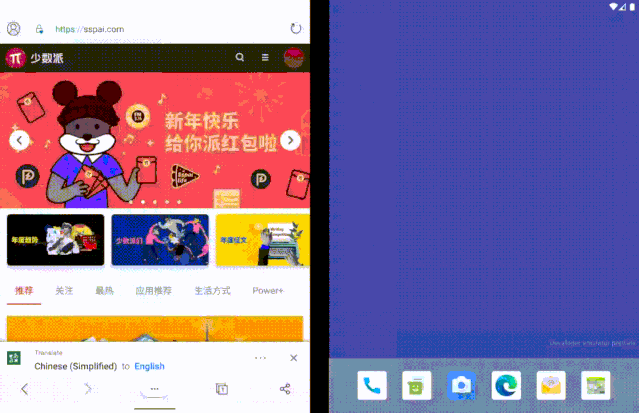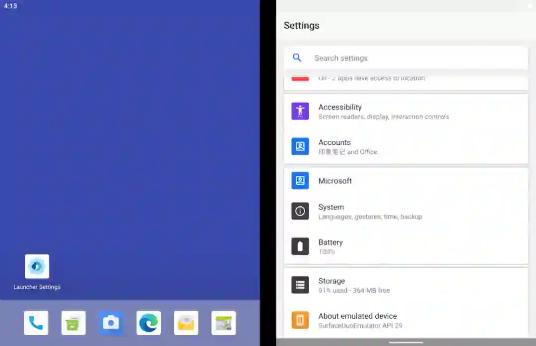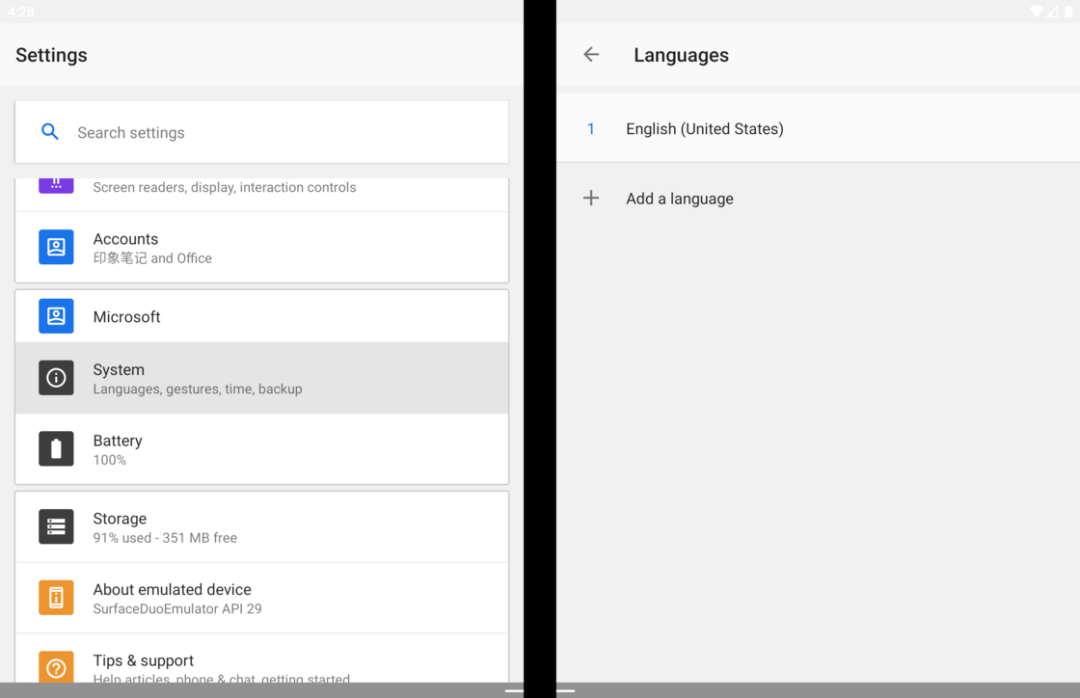 微软车库孵化过一大批 Android 和 iOS 应用,微软启动器(此前叫做 Arrow Launcher)就是这当中的佼佼者。因为桌面启动器在 Android 系统中的特殊地位,微软启动器一度被很多人看作是微软借软件服务重回移动领域的「排头兵」,它所采用的交互和设计也间接促使了 Windows 10X 的诞生,当然这都是后话了。Windows 10X尽管版本号比 Play 商店中最新的微软启动器预览版还要高,Surface Duo 模拟器中的桌面启动器现阶段不仅功能十分基础,设计和交互逻辑也与常见 Android 启动器类似。 应用抽屉与设置界面更重要的是,作为一款双屏设备上的启动器,当我们从主屏进入应用抽屉时,应用抽屉的呈现逻辑目前仍然基于同一侧屏幕,另一侧屏幕的作用更像是一块完全独立的外接屏幕。设置存在割裂,整体性并不强所以说即便是双屏定制,微软桌面在上面的适配的完成度也仅仅只能算是「可用」。在普通手机版上的微软桌面上可以通过向左滑动来打开负一屏,类似 Google Feed 提供了资讯信息以及个人待办事项,其实在这个模拟器上应该也能呈现类似的效果。但或许是地区设置的问题(事实上多语言切换都处于「coming soon」的状态),我在模拟器上并没有找到打开这个负一屏的入口。点击添加语言会直接闪退跳出启动器之外,有些场景下的双屏交互似乎也不是预览阶段微软计划解决的。模拟器系统完全沿用了 Android 10 的手势操作,但两侧屏幕靠近铰链的边缘均无法触发返回手势。因此从系统导航手势这个层面上来说,左右两侧屏幕现阶段只是被识别为一块屏幕的左右两个区域,而非(可以)相互独立交互的两块屏幕,这似乎又和折叠屏形态的出发点背道而驰了。这种硬件形态设想和 Android 软件底层的「冲突」在模拟器系统中随处可见,有时候在一侧屏幕上打开系统设置,点击进入的二级设置菜单可能会自动跳到另一侧屏幕上,来回跳转逻辑可谓是相当混乱。浏览器想要用手势返回到上一页,需要移到左侧屏幕但也有一些还算顺手的地方。比如我们可以在两个屏幕分别打开不同的应用,应用之间不仅可以通过Android 10 的手势进行切换,将应用卡片拖动到不同的屏幕时,也可以通过屏幕上的提示选择不同的展示方式,体验与 Windows 上拖动鼠标排列显示窗口类似。拖动选择应用显示方式