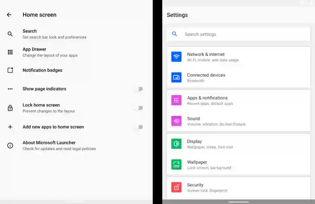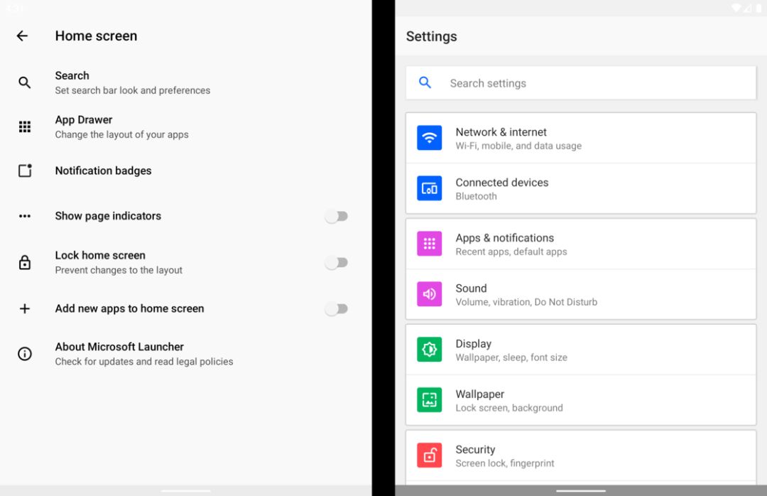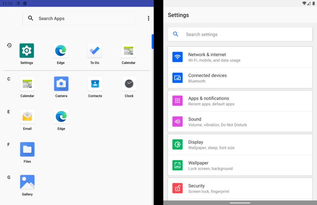 和发布会演示中接近完全形态的操作系统相比,预览版模拟器中我们看到的操作系统完成度在 70% 左右。即便如此,这个未来会在 Surface Duo 上搭载的操作系统也已经和市面上大部分 Android 设备有着不小的差异。这种差异来自微软对 Android 的改造。启动器更像是常见的 Android 启动器一分为二从系统信息来看,Surface Duo 模拟器操作系统基于最新 Android 10 的 AOSP 代码,因此和常见 Android 模拟器一样,这个系统也还没有嵌入 Google Play 服务。不过在发布会上我们已经看到了包含 Google Play 应用商店的演示,从定制系统的角度来说,微软也不太可能完全阉割掉 Google Play 服务,更有可能的情况是,Surface Duo 会在系统中提供基础的 Google 服务框架和 Play 商店,其他组件则不会进行预装。这种定制思路在 Surface Duo 模拟器的操作系统中已有体现:相比 Pixel 这类设备搭载的 Android 10 系统,Surface Duo 模拟器系统中「账户」系统默认只有微软账户,默认浏览器则是最新版 Edge 浏览器。左侧为启动器主界面,右侧为系统设置早年我们曾畅想并尝试过在 Android 设备上使用「微软全家桶」,而对 Surface Duo 而言,采用一套类似 Google 账户同步的微软账号同步体系的确是完全可行的,现阶段 Edge 浏览器的同步设置中也已经有了这样的趋势。虽然模拟器搭载的电话和短信均为 AOSP 原生应用,借助 Exchange 服务和 Skype 联系人数据同步,未来将 Surface Duo 和 Skype 数据打通、甚至将 Skype 平滑植入到这个定制 Android 系统中也不无可能。功能简陋不考虑左右双屏这一形态,Surface Duo 模拟器整体依然给人一种「微软味」定制 Android 的味道,大量未经修饰的原生 Android 痕迹和时不时出现的微软应用、服务交替,距离发布会演示的那种「整体感」还有一段距离。