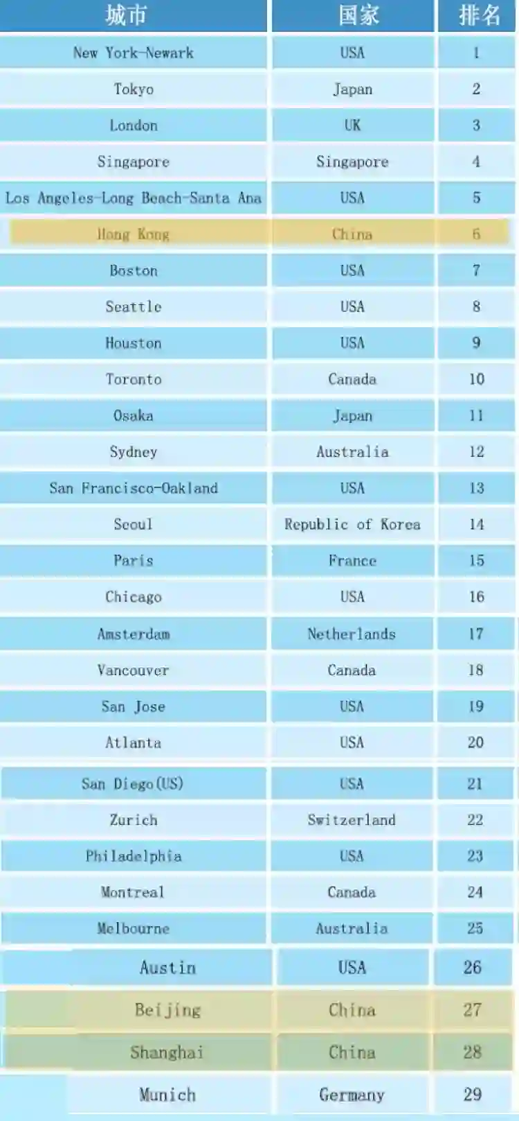 该排名中,中国共有五城进入TOP20。其中,深圳位列全球第4名,其余进入前20强的分别为香港(第11名)、上海(第13名)、广州(第14名)和北京(第19名)。苏州、武汉、天津、南京和台北共10个城市进入前50强,成都、长沙、无锡、杭州、重庆、青岛、佛山、郑州和宁波共18个城市进入前100强。