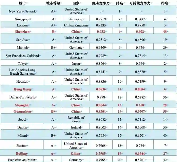 此外,报告还包含可持续竞争力指数,可持续竞争力指一个城市通过提升其经济、社会、环境和技术优势,更好、更持续地满足城市居民复杂而挑剔的社会福利的长期可持续的能力。此次进入前20强的城市包括:纽约、东京、伦敦、新加坡、洛杉矶、香港、波士顿、西雅图、休斯顿、多伦多、大阪、悉尼、旧金山、首尔、巴黎、芝加哥、阿姆斯特丹、温哥华、圣何塞和亚特兰大。