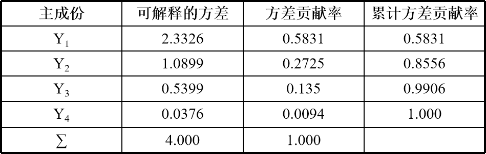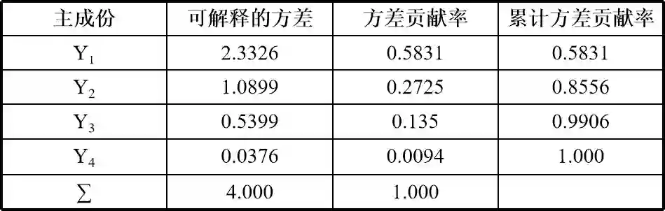 可以看到第一主成分Y1和第二主成分Y2的累计方差贡献率已经达到了85.56%,可以认为,用这两个主成分来代替4个原始变量,也不会造成太多信息损失。