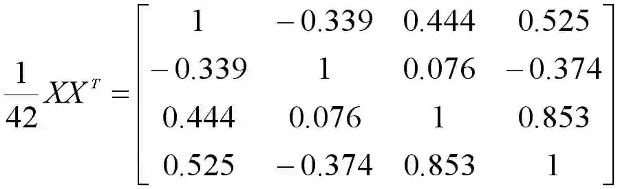 将每个样本作为列向量构成一个矩阵,并对矩阵的每一个行向量进行0均值化,得到了4行42列的数据集矩阵X。