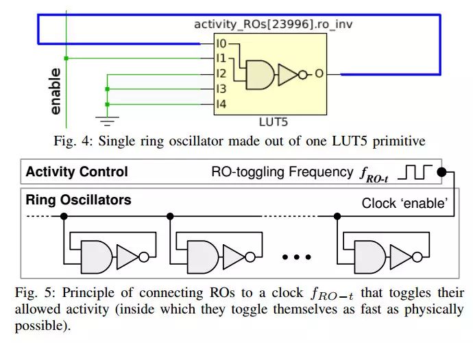 为了达到瞬间改变FPGA负载的效果,作者将一个逻辑单元的输出经过一个非门连回到输出端。如下图所示,这样的电路构成了一个正反馈的环形振荡器(Ring Oscillator)。环形振荡器里的CMOS开关管会以极快的速度翻转,消耗大量电流。大量逻辑单元都被设置成这样的环形振荡器,并且通过一个使能信号控制所有振荡器,就能瞬间改变FPGA的电流负载。通过控制使能信号的开关频率fRO-t,可以模拟不同的负载变化来观察其对FPGA的影响。
