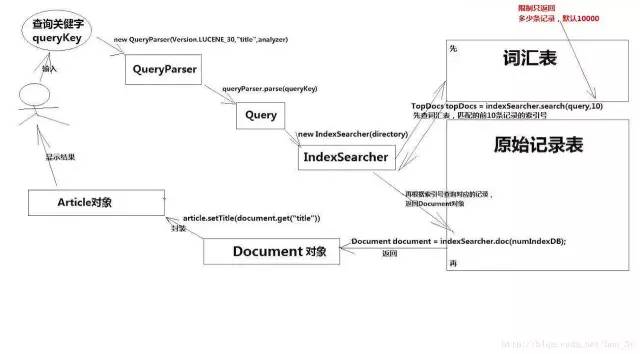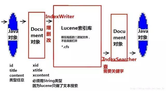 我们的Lucene程序就是大概这么一个思路:将JavaBean对象封装到Document对象中,然后通过IndexWriter把document写入到索引库中。当用户需要查询的时候,就使用IndexSearcher从索引库中读取数据,找到对应的Document对象,从而解析里边的内容,再封装到JavaBean对象中让我们使用。