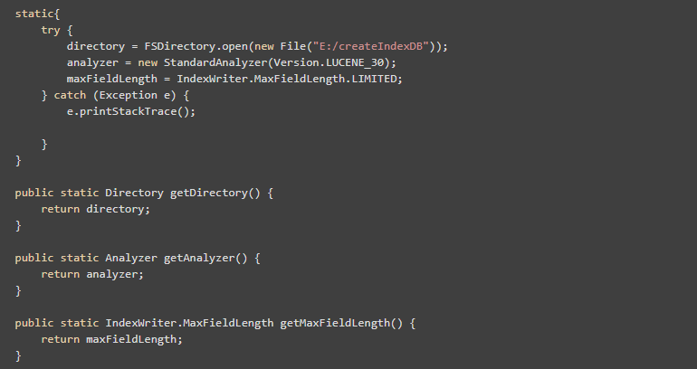 IndexWriter indexWriter = new IndexWriter(LuceneUtil.getDirectory(),LuceneUtil.getAnalyzer(),LuceneUtil.getMaxFieldLength());