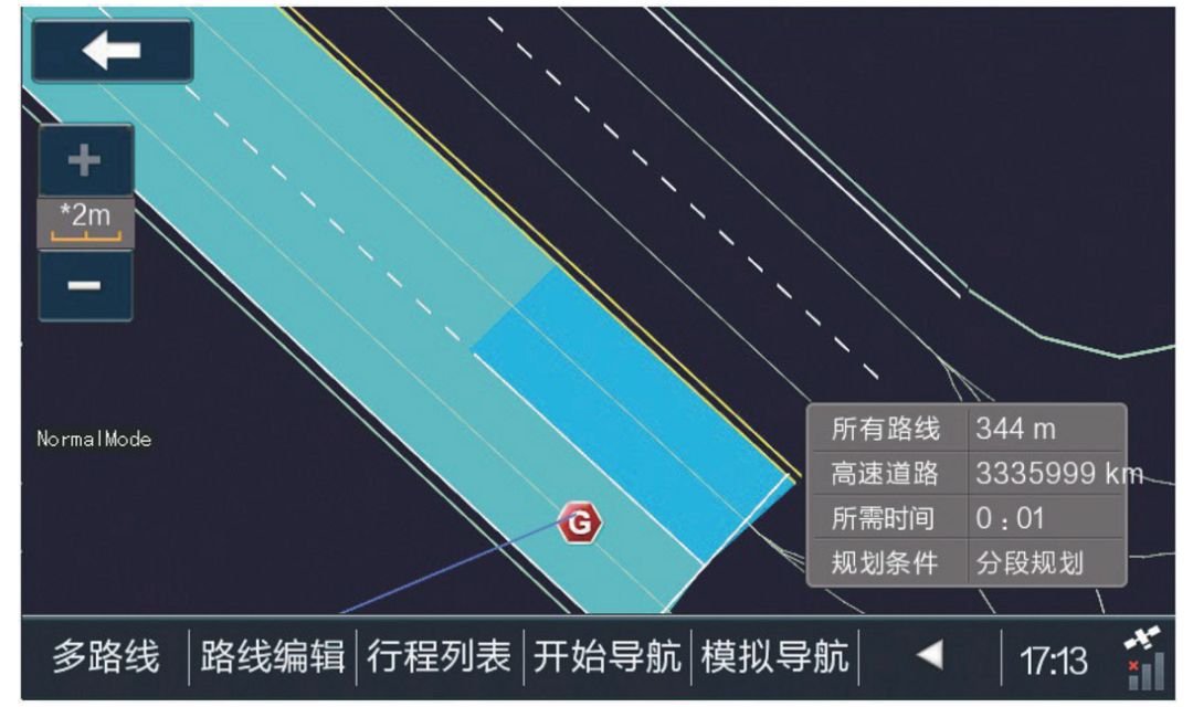 通过应用程序实现上述路径规划方法的展示结果如图 8 所示,其中 G 代表终点;浅青色代表路径规划结果,即可通行区间集合;蓝色区块代表被过滤的车道区间,该区域横向上以实线分隔车道,不能从蓝色区块变道到 G 点所在车道,即无法达到目的地,因此被排除在路径规划结果之外,而根本原因则是车道驾驶态势不同。