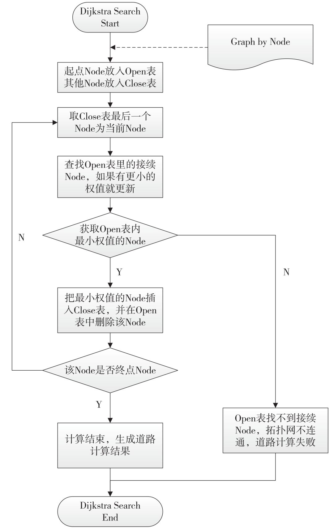 基于 lanezone 级别的拓扑关系,其实质是一种含权重的有向图,因此可以使用双向 Dijkstra 算法进行最优路径规划。首先根据定位匹配结果计算起点和终点所在的 lanezone 编号,然后从起点到终点进行正向搜索,获得起点能达到的 lanezone 序列,再从终点到起点反向搜索,获得终点能达到的 lanezone 序列,两次搜索后,将既能达到起点也能达到终点的 lanezone 放入结果,即路径规划结果。Dijkstra 算法流程如图 6 所示,Open 表保存所有已生成而未考察的节点,Close 表记录已访问过的节点。