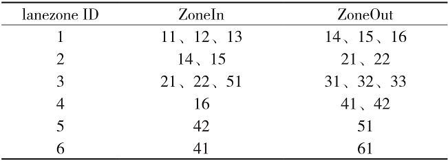 lanezone 内部拓扑关系如表 1 所示。在 lanezone 内 ZoneIn 任意一个拓扑点均可到达 ZoneOut 任意一点,因此 ZoneIn 和 ZoneOut 可以看作是 lanezone 的「接口」,只要能从 ZoneIn 驶入,就可从 ZoneOut 驶出。