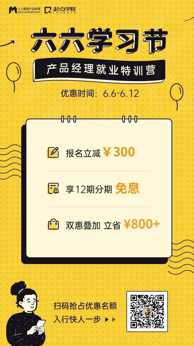 【重点】现在报名特训营享限时66学习节特惠:报名立减¥300,加享12期分期免息!优惠截止6月12日,扫海报二维码立即申请优惠: