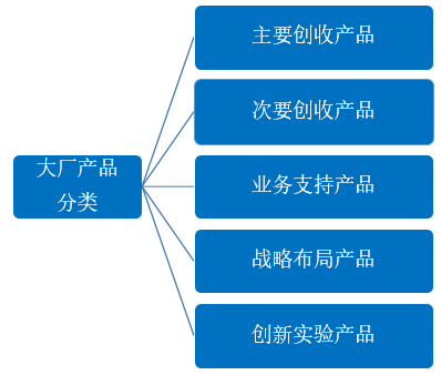 一般来讲,大厂的产品可以按“主要创收产品、次要创收产品、业务支持产品、战略布局产品、创新实验产品”分为五类。