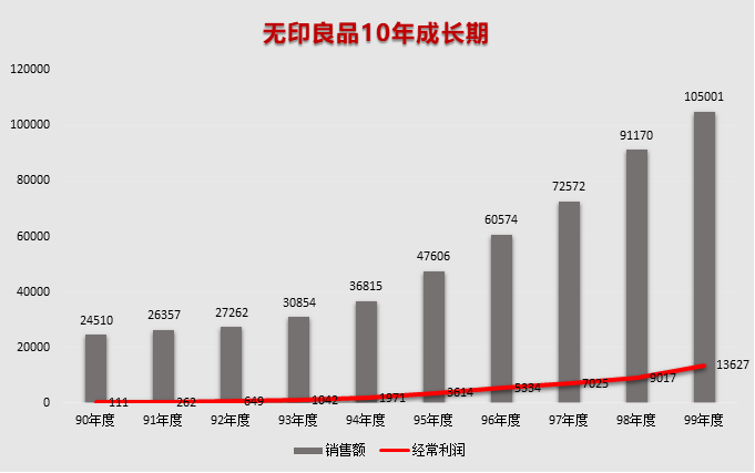 但无印良品90年销售额只有245亿日元,经常利益(経常利益=営业利益+営业外収益-営业外费用)只有1亿日元,然而到99年时,经常利益已经达到136亿日元。