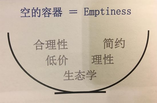 这张图片非常形象化地体现了“空的容器”这样的概念,无印良品开发出来的商品都是相当于一个空的容器,里面可以容纳所有的价值观,比如说合理性、简约、低价、生态学、理性这样的价值观: