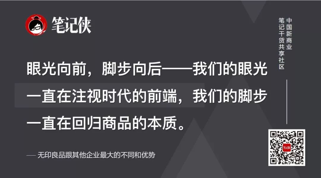 无印良品跟其他企业最大的不同和优势就是在于,“眼光向前,脚步向后——我们的眼光一直在注视时代的前端,我们的脚步一直在回归商品的本质。”