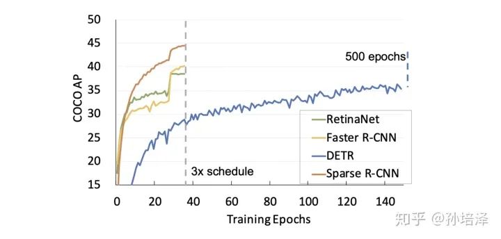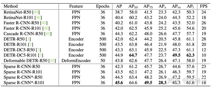我们沿用了Detectron2的3x training schedule,因此将Sparse R-CNN和Detectorn2中的detectors做比较(很多方法没有报道3x的性能,所以没有列出)。同时,我们也列出了同样不需要NMS后处理的DETR和Deformable DETR的性能。Sparse R-CNN在检测精度,推理时间和训练收敛速度都展现了相当有竞争力的性能。