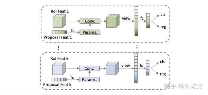 这组学习到的proposal boxes可以理解为图像中可能出现物体的位置的统计值,这样coarse的表征提取出来的RoI feature显然不足以精确定位和分类物体。于是,我们引入一种特征层面的candidates,proposal features,这也是一组可学习的参数,N*d,N代表object candidates的个数,与proposal boxes一一对应,d代表feature的维度,一般为256。这组proposal features与proposal boxes提取出来的RoI feature做一对一的交互,从而使得RoI feature的特征更有利于定位和分类物体。相比于原始的2-fc Head,我们的设计称为Dynamic Instance Interactive Head.