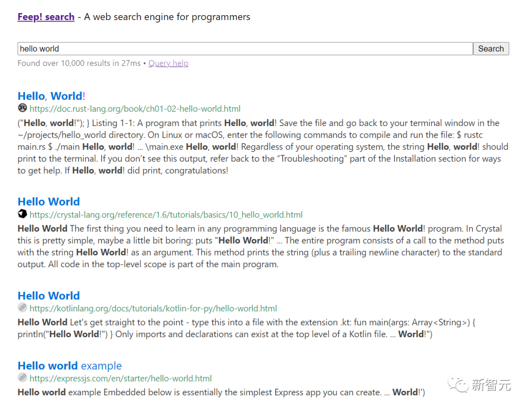 以程序员们最经典的上手程序「hello word」为例,仅用时27毫秒,「Feep! search」那简洁而不简单的界面便检索出超1万条结果。你可以从中轻松找出许多能够实际运行的成熟代码。