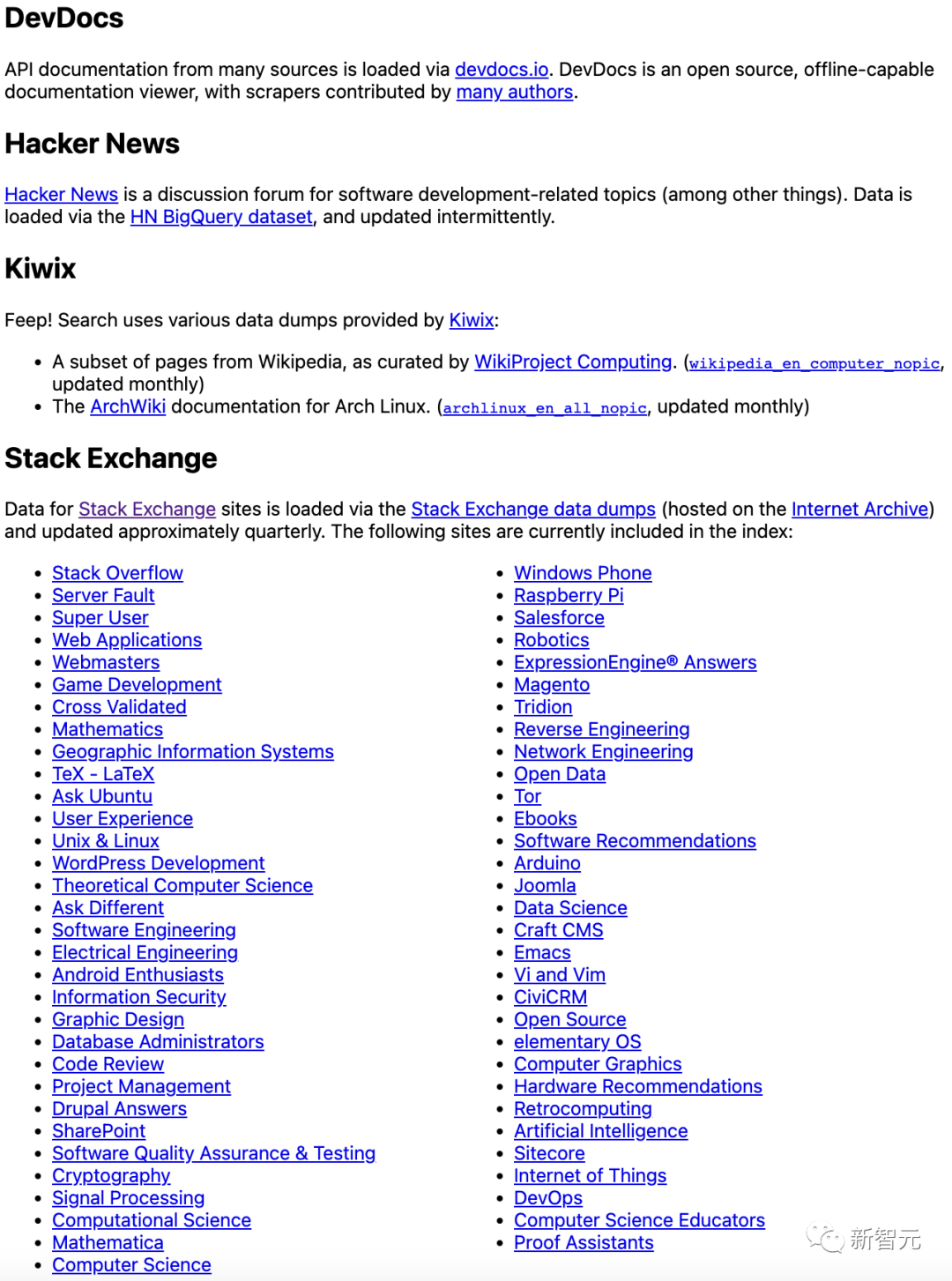 目前,「Feep! search」能够检索的信息源,包括DevDocs、Hacker News、Kiwix、Stack Exchange等,甚至还包括一些已索引但未爬网的链接,信息总量超过2900万页——这甚至比谷歌1998年推出的第一款搜索引擎还要多(2600万页)。