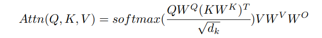 在不失一般性的情况下,研究人员研究了1-head的情况。其中Q、K、V分别指query、key和value。而WQ、WK、WV都是输入的映射矩阵。WO则是输出的映射矩阵。因此,注意力方程式可以写作: