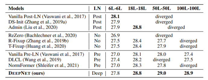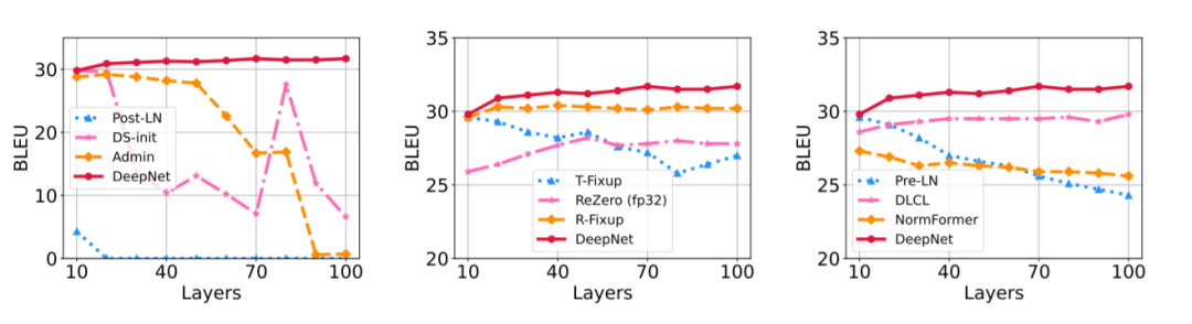 我们将DEEPNET与多个最先进的深层Transformer模型进行了比较,包括DLCL、NormFormer、ReZero、R-Fixup,T-Fixup,DS-init等。